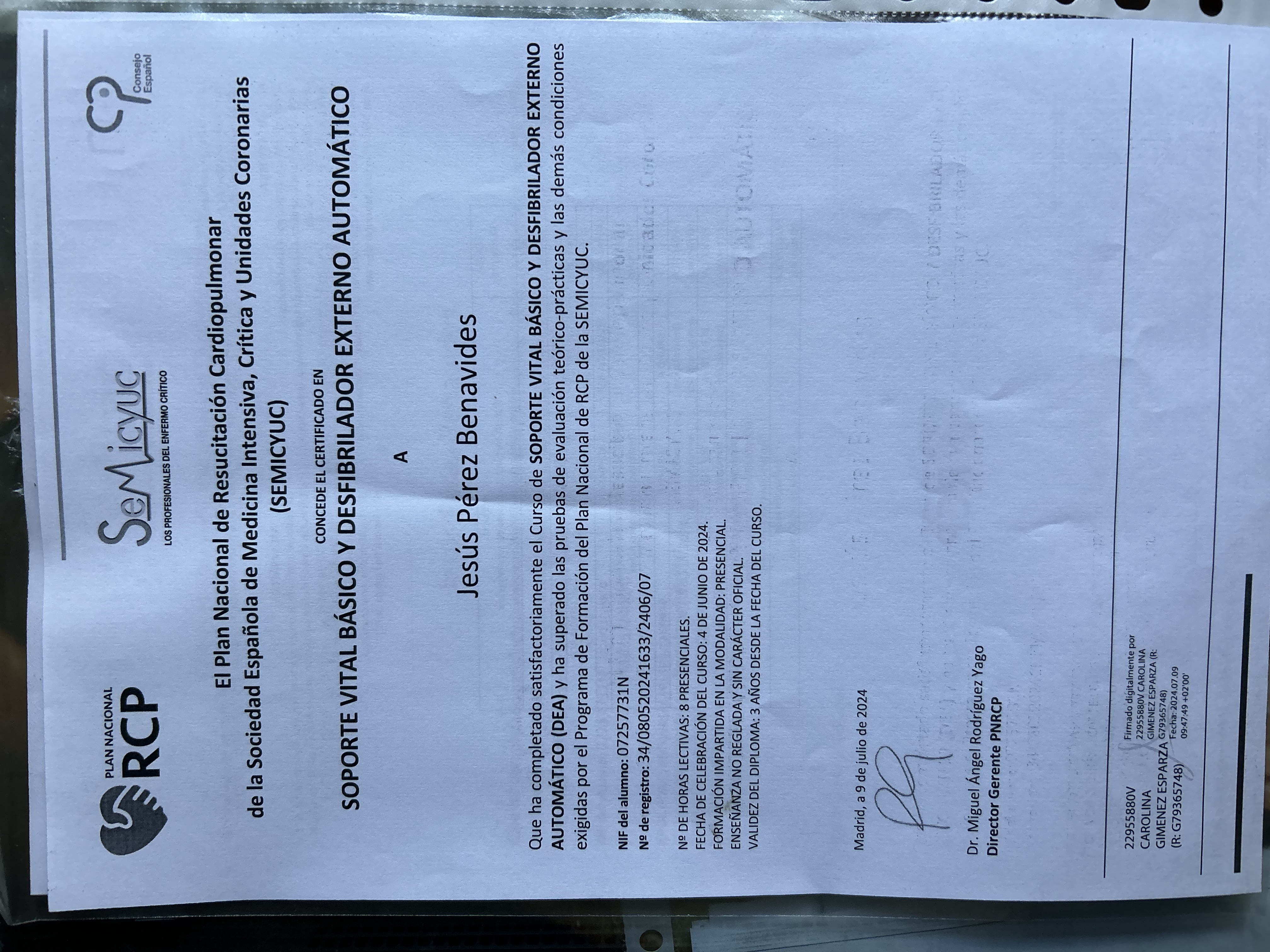 Que ha completado satisfactoriamente el Curso de SOPORTE VITAL BÁSICO Y DESFIBRILADOR EXTERNO AUTOMÁTICO (DEA) y ha superado las pruebas de evaluación teórico-prácticas y las demás condiciones exigidas por el Programa de Formación del Plan Nacional de RCP de la SEMICYUC.