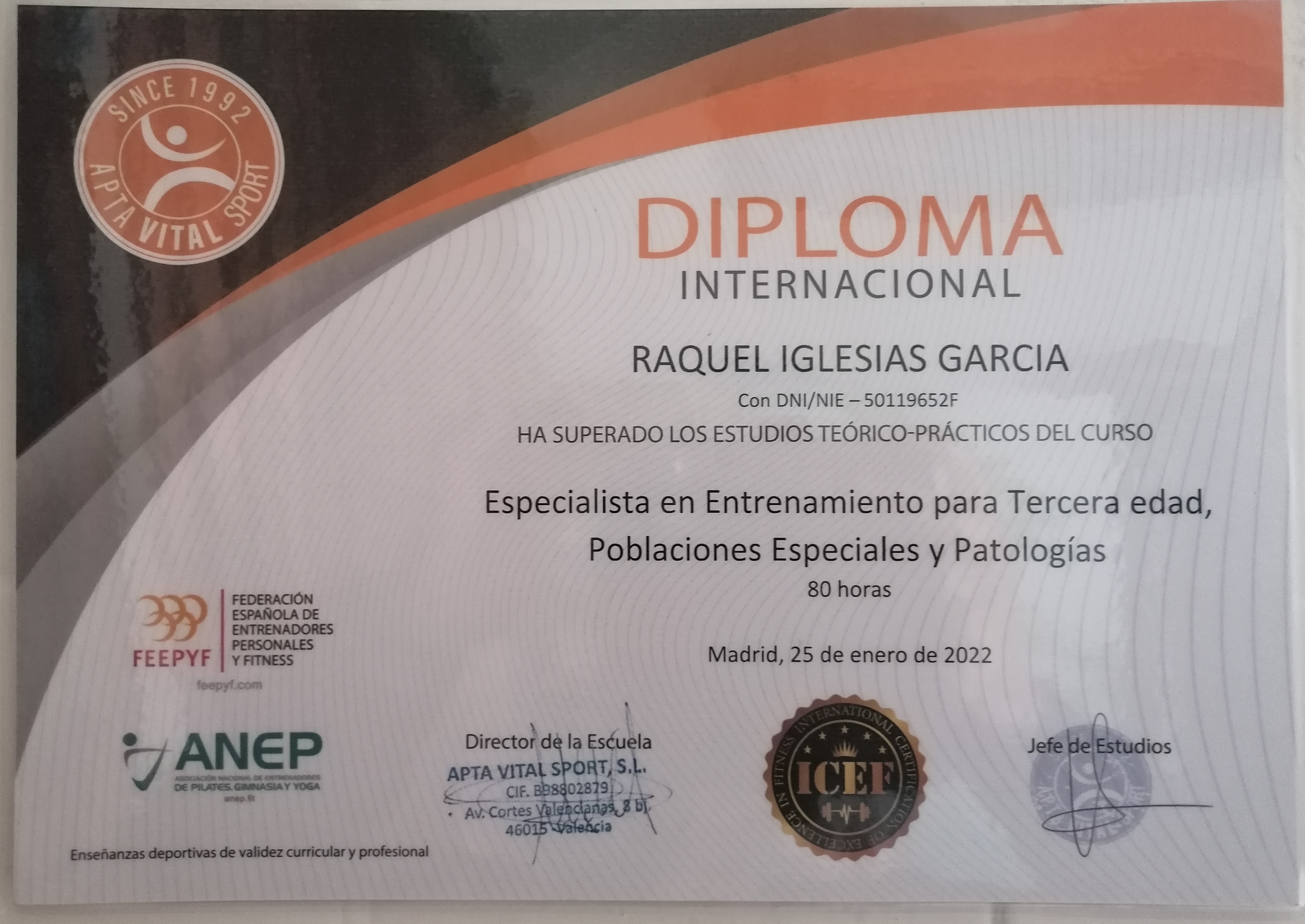 Estoy especializada en distintas técnicas de Entrenamiento, como el Ejercicio Físico Femenino a partir de los 40 años(pre-menopausia, menopausia y post-menopausia),ejercicio correctivo de la postura corporal y el ejercicio en Patologías Específicas y Poblaciones Especiales,como por ejemplo personas de la Tercera Edad (Ictus, Parkinson,Sarcopenia, Osteoporosis, EPOP, Artrosis,...). Como verás en mis titulaciones cuento con formación específica para tu mayor seguridad, además cuento con otras formaciones para que juntos logremos tus objetivos tanto si es perdida de peso, mejora de tu energía, aprender buenos hábitos alimenticios, aumentar tu masa muscular y reducir el volumen de grasa,entre muchos otros.